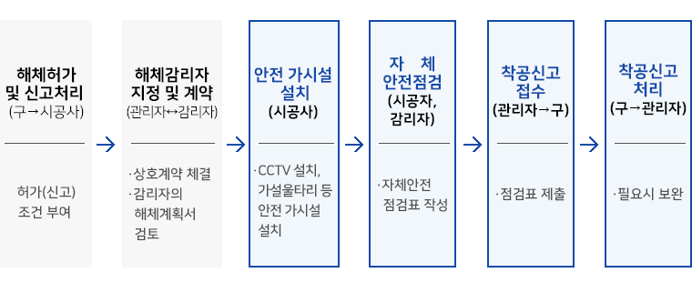 그러나 앞으로 모든 해체공사장은 시공자가 착공 전 가설울타리, CCTV 같은 안전 가시설물을 설치하고, 감리자의 안전점검을 마친 후, 허가권자(자치구)가 이를 검토·승인하면 실질적인 해체작업을 시작할 수 있다.