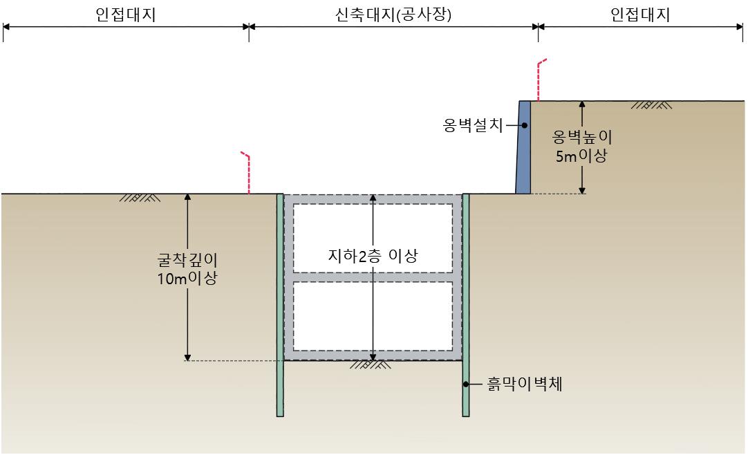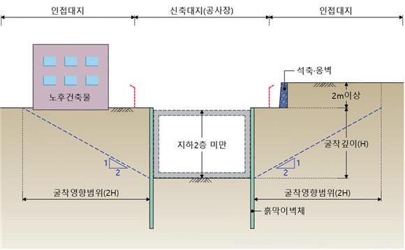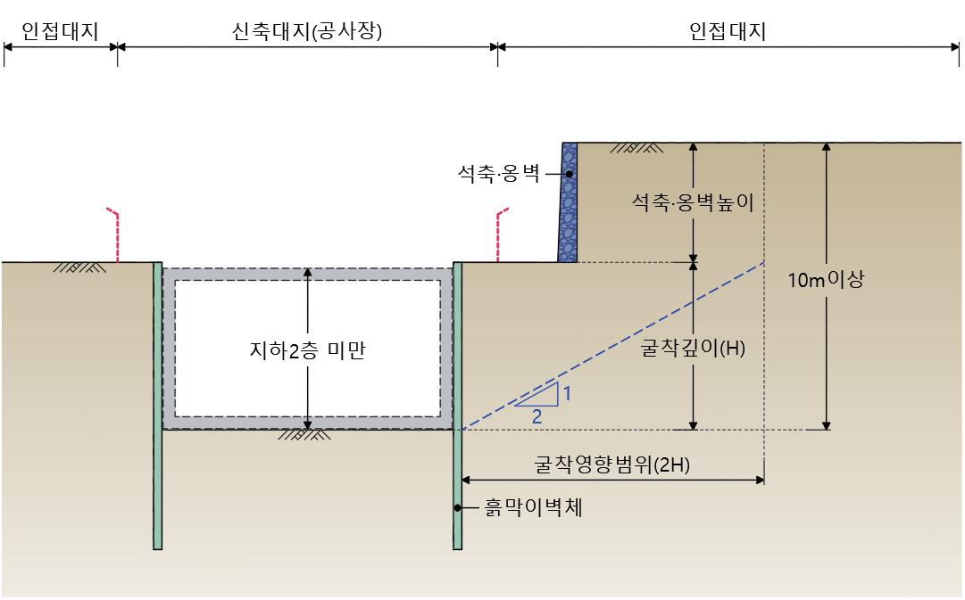 - 굴착영향 범위 내 석축ㆍ옹벽 등이 위치하는 지하 2층 미만 굴착공사로서