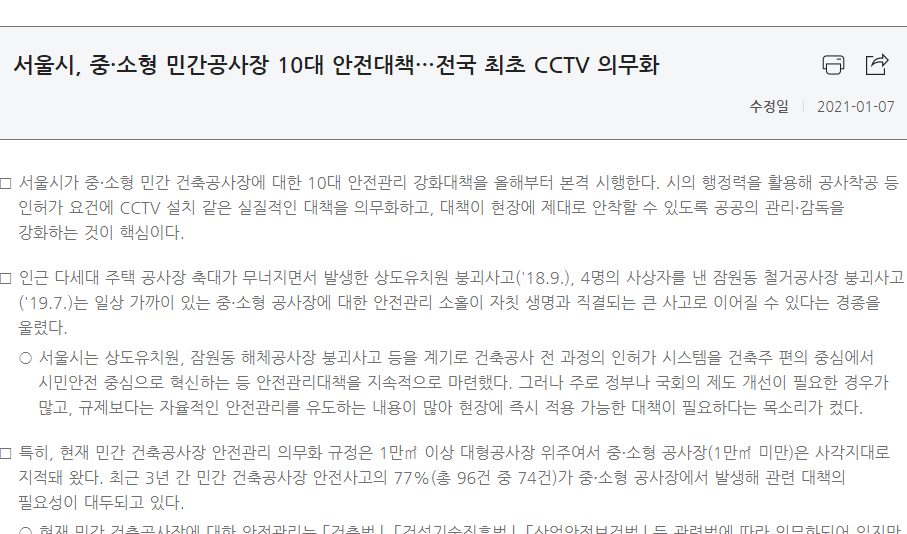 □ 서울시가 중·소형 민간 건축공사장에 대한 10대 안전관리 강화대책을 올해부터 본격 시행한다. 시의 행정력을 활용해 공사착공 등 인허가 요건에 CCTV 설치 같은 실질적인 대책을 의무화하고, 대책이 현장에 제대로 안착할 수 있도록 공공의 관리·감독을 강화하는 것이 핵심이다.